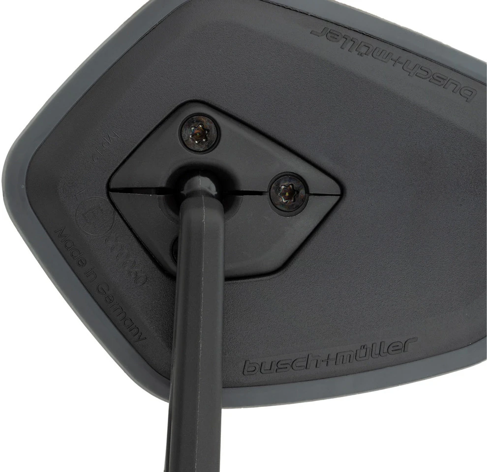 Der Cycle Star E Rückspiegel von busch+müller hat eine große, fünfeckige Spiegelfläche nicht nur für schnelle E-Bikes. Der weiche Rahmen um den Spiegelkopf bietet Schutz bei Kollisionen. Der Spiegel ist mit dem “ E“ -Prüfzeichen versehen und somit für schnelle E-Bikes zugelassen, die mit einem geprüften Spiegel ausgerüstet sein müssen. Trotzdem ist er auch für andere Fahrräder geeignet.