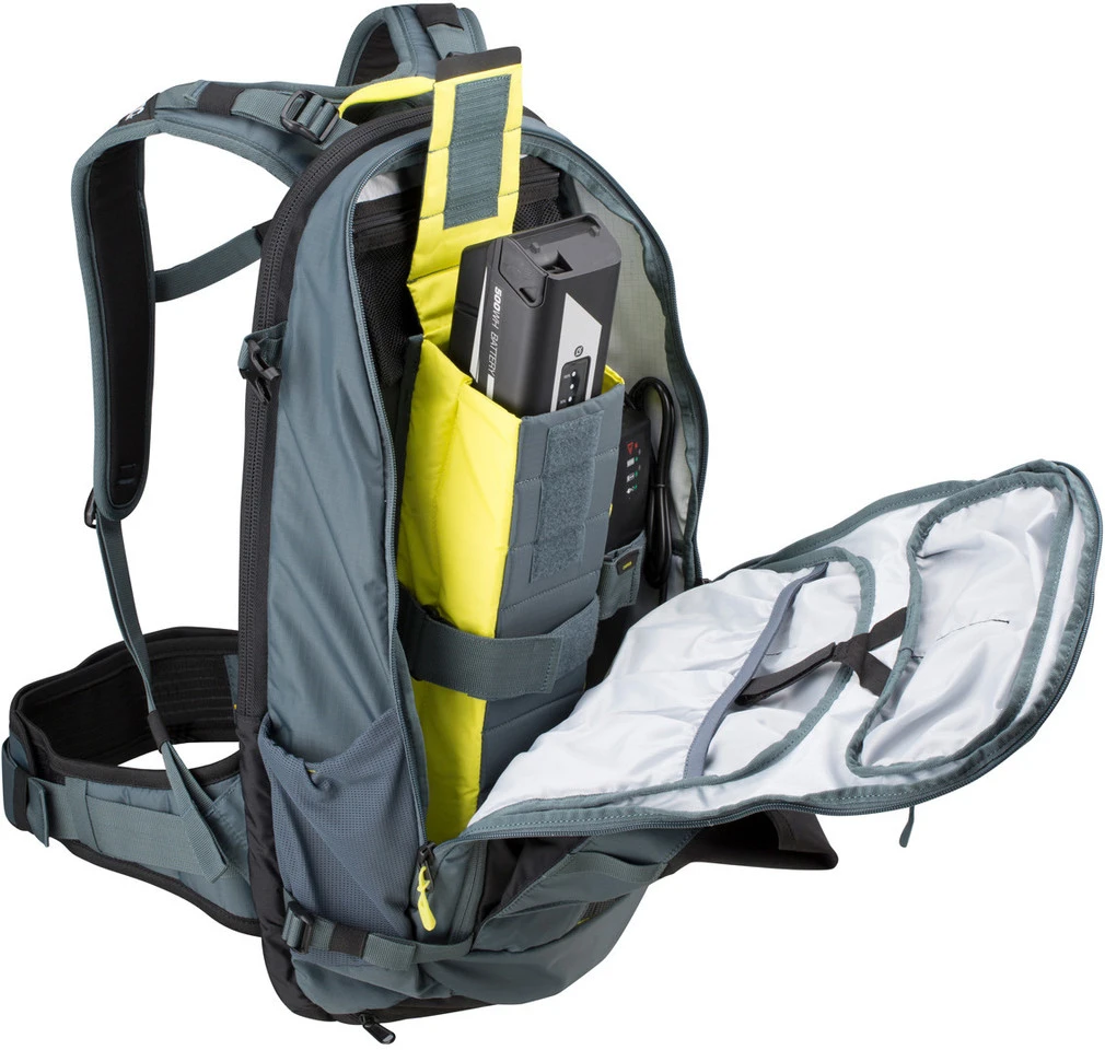 E-Mountainbike-Abenteurer kennen das Dilemma: Ersatzakkus und Zubehör für E-Bikes bringen nicht nur mehr Gewicht mit sich, sie müssen auch sicher und rutschfest verstaut werden und dürfen im Falle eines Sturzes keine zusätzliche Gefahr für die Wirbelsäule darstellen. Mit seinem neuen E-Mountainbike-Protektor-Rucksack löst evoc diese Probleme. Der Rucksack verfügt im Hauptfach über ein extrem stabiles, gepolstertes Spezialfach aus Nylon-Ripstop für einen der drei marktgängigsten E-Mountainbike-Akkus von Bosch, Panasonic und Yamaha.