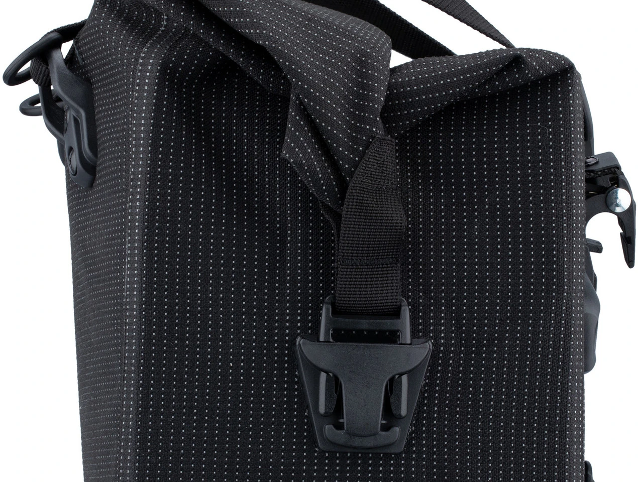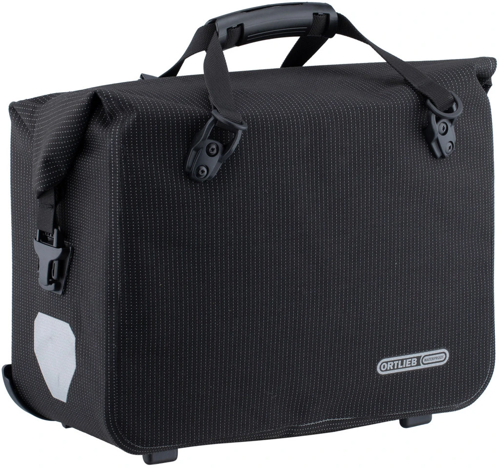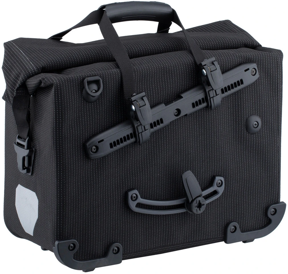 Freigaben:Belastbarkeit (max.):9 kgFeatures:wasserdichte Aktentasche aus vollflächig reflektierendem Gewebe, mit Quick-Lock2.1-HalterungssystemTaschenumfang leuchtet bei LichteinfallRollverschlussPU-beschichtetes Cordura-GewebePlatz für ein oder zwei DIN-A4-Ordner, Schreibwaren, Wertgegenstände etc.Innenunterteilung mit aufgesetzten Taschendurch drehbare Aufhängung wahlweise links (= Standard) oder rechts zu befestigenschräge Einhängung für optimale BeinfreiheitHandgriffabnehmbarer, gepolsterter SchultertragegurtD-Ringe zur Befestigung des Schultertragegurtszwei leuchtstarke Reflektoren aus 3M™ Scotchlite™ Reflexmaterialreflektierendes ORTLIEB-Logo vorneFüßchen zum schonenden Abstellen der Tascheaufgesetzte Scheuerleisten auf der Rückseite links und rechts untenPVC-freiMade in Germany