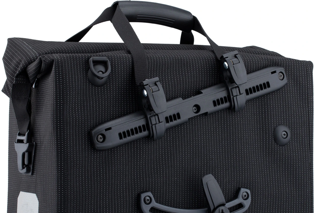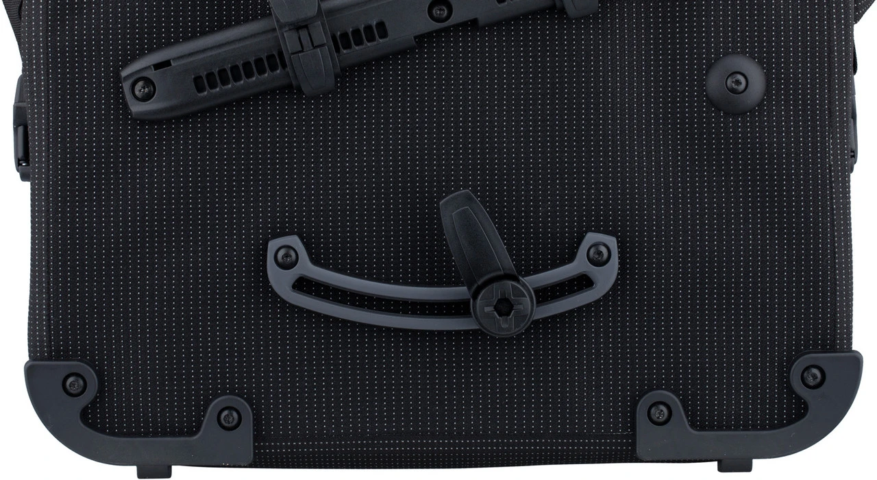 Das Quick-Lock2.1-Halterungssystem basiert auf dem bewährten Quick-Lock2-System, bietet jedoch einige Verbesserungen. Die obere Schiene, in der auch die optionale Diebstahlsicherung angebracht werden kann, ist einteilig ausgeführt, was ein Plus an Stabilität mit sich bringt. Auf der Innenseite kommen besonders flache Unterlegscheiben zum Einsatz, so wird der Tascheninhalt durch diese kaum beeinträchtigt. Der Taschengriff dient als Riegel: Hebst Du den Griff an, öffnen sich die Halterungshaken, lässt Du ihn los, schließen sie sich. Die Reduzierstücke für unterschiedliche Rohrdurchmesser werden seitlich eingeschoben und bleiben so sicher an Ort und Stelle. Zusätzlich zu den serienmäßig mitgelieferten 16 mm Grundhaken mit Reduzierstücken in 8 und 10 mm, liegen nun auch 12 mm Einsätze bei. Optional erhältlich ist zudem ein 20 mm Reduzierstück, passend für den Gepäckträger mit großem Rohrdurchmesser, wie sie teilweise an E-Bikes verbaut sind. Der Zwei-Komponenten-Kunststoff mit Anti-Scratch-Funktion, der für die untere Schiene in Form einer Halbellipse verwendet wird, sorgt für weiche Auflageflächen und reduziert die Reibung am Gepäckträger. Der untere Haken kann variabel angepasst und in 15-Grad-Schritten gedreht werden. Die Handhabung ist denkbar einfach: Für die Einstellung der Haken wird kein Werkzeug benötigt.