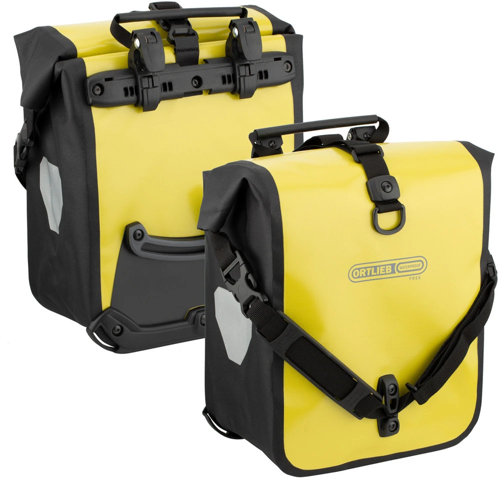 Die PVC-freien ORTLIEB Sport-Roller Free sind dauerhaft wasserdichte Fahrradtaschen mit Rollverschluss, die mit ihrem robusten Planen-Stoff aus PU-beschichtetem Polyestergewebe überzeugen. Mittels Quick-Lock2.1-Halterungssystem bringst Du sie einzeln oder paarweise an Deinem Lowrider-Gepäckträger an, oder befestigst sie alternativ als kleine Packtasche am hinteren Gepäckträger. Steigst Du vom Bike ab, kannst Du sie dank Schultertragegurt bequem zur Umhängetasche umfunktionieren.