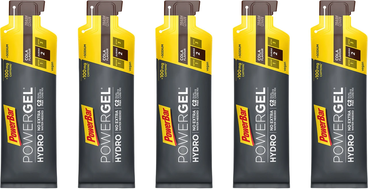 2 x Gel PowerBar PowerGel Hydro, cola – caffeine, Nettofüllmenge 134 ml1 x Gel PowerBar PowerGel Hydro, mojit