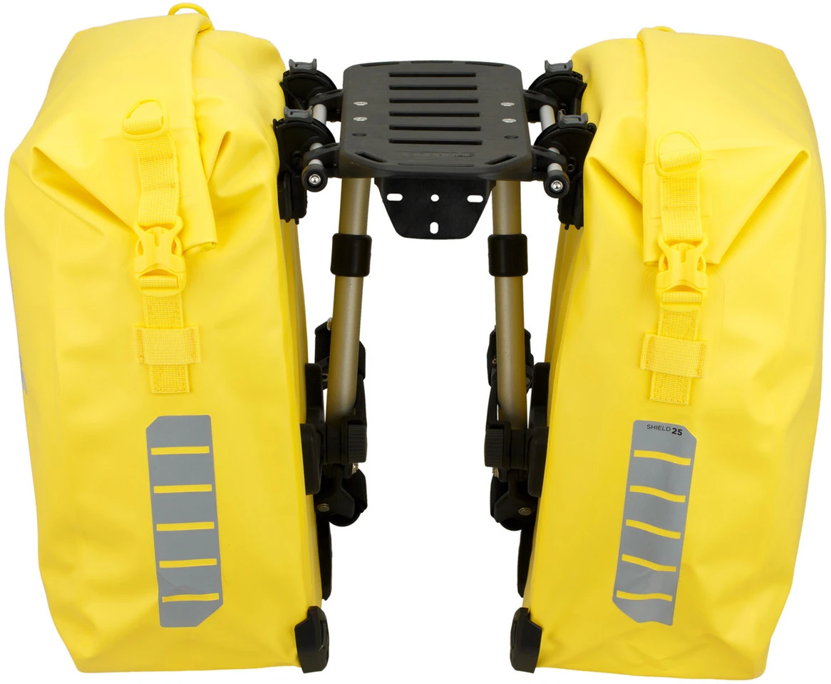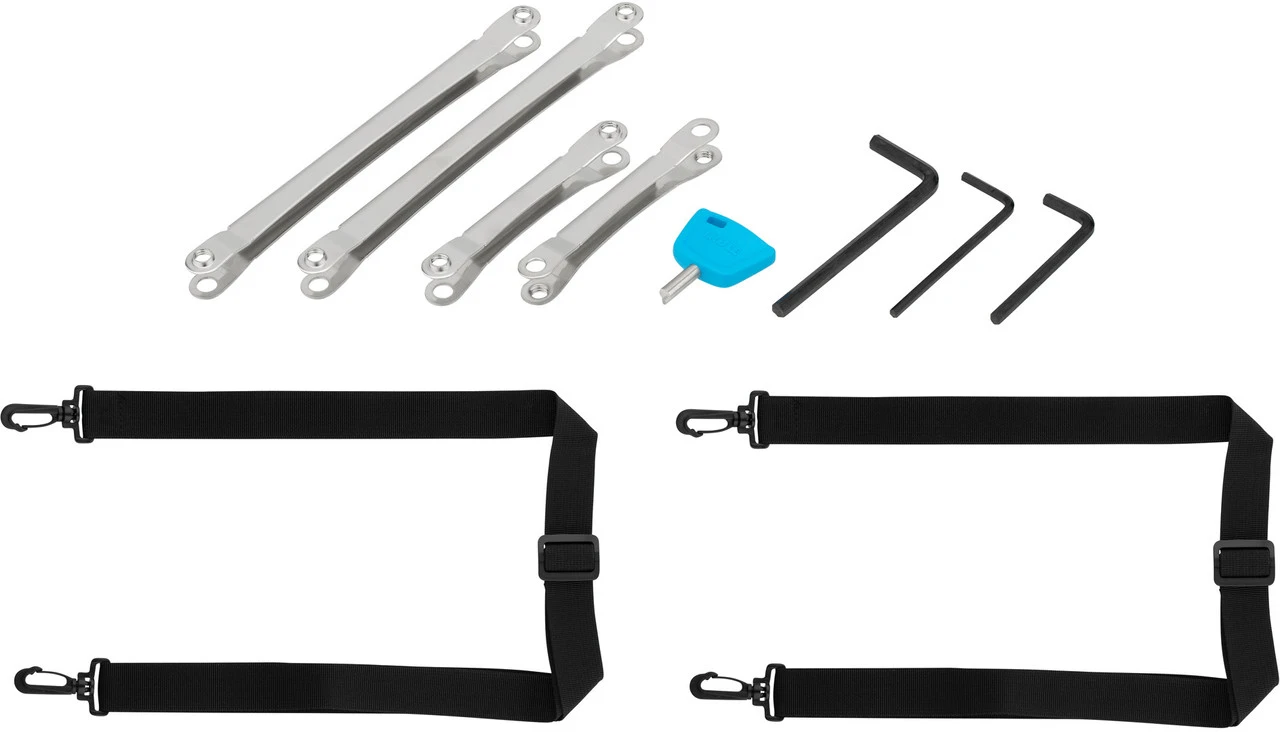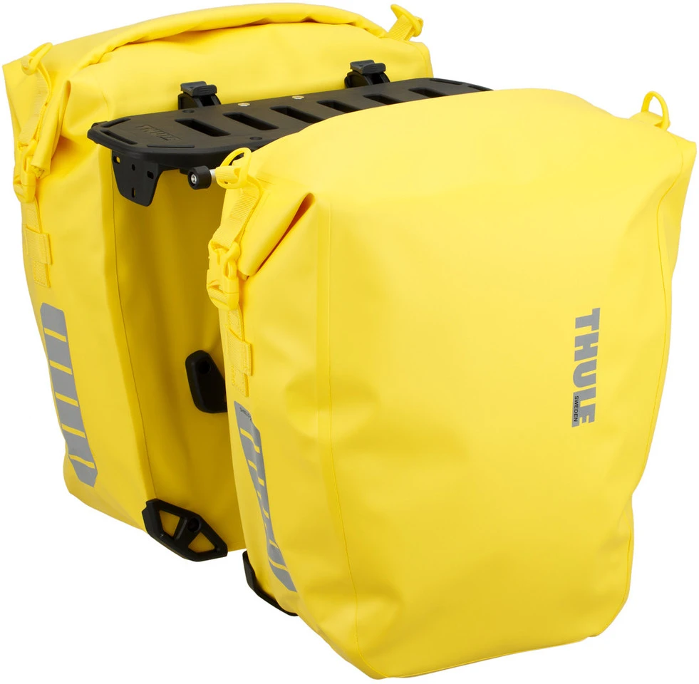 Spezifikationen Fahrradtaschen:Einsatzbereich:Touring & Trekking, CityAusführung:GepäckträgerKompatibilität:für Gepäckträger mit 10 bis 16 mm DurchmesserMaterial:400D Nylon mit TPE-LaminatSchutzklasse:Regen- und Spritzwasserschutz (IP64)Maße (HxBxT):46 x 41 x 13 cmVolumen:25 LiterSpezifikationen Gepäckträger:Einsatzbereich:City, Touring & TrekkingBefestigung oben:HinterbaustrebenbefestigungBefestigung unten:HinterbaustrebenbefestigungLaufradgröße:bis zu 29″ x 2,5″Zuladung (max.):11 kg (hinten), 10 kg (vorne)Technische Daten Gepäckträger:Material:Nylon, Stahl, AluminiumFeatures:Gepäckträger mit Schienen zur Befestigung der Packtaschenpatentiertes, einfach zu montierendes Befestigungssystemmontierbar an den Hinterbaustreben oder an der Gabelverwendbar an jedem Rahmenmaterialrobuste Konstruktion ermöglicht einen vielfältigen Einsatz auch auf Fahrten in rauem Geländevibrations- und geräuschloswasserdichte Taschengeschweißte Nähte und Rollverschlussohne WeichmacherTaschen mit Befestigungsmöglichkeit für FahrradlichterReflektoren auf den Taschen für bessere Sichtbarkeit3 Innentaschen für Dokumente und kleineres Zubehörabnehmbarer SchulterriemenLieferumfang:2 x Fahrradtasche Thule Shield Pannier L1 x Gepäckträger Thule Tour Rack2 x Schultergurt