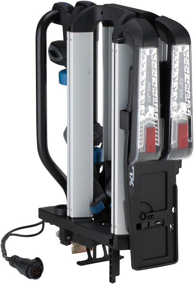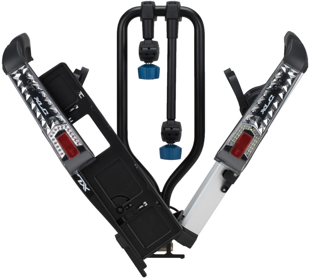 Der XLC Fahrradträger Azura Easy LED für die Anhängerkupplung hat genug Platz für zwei Bikes bis 30 kg und lässt sich nach Gebrauch kompakt zusammenfalten.